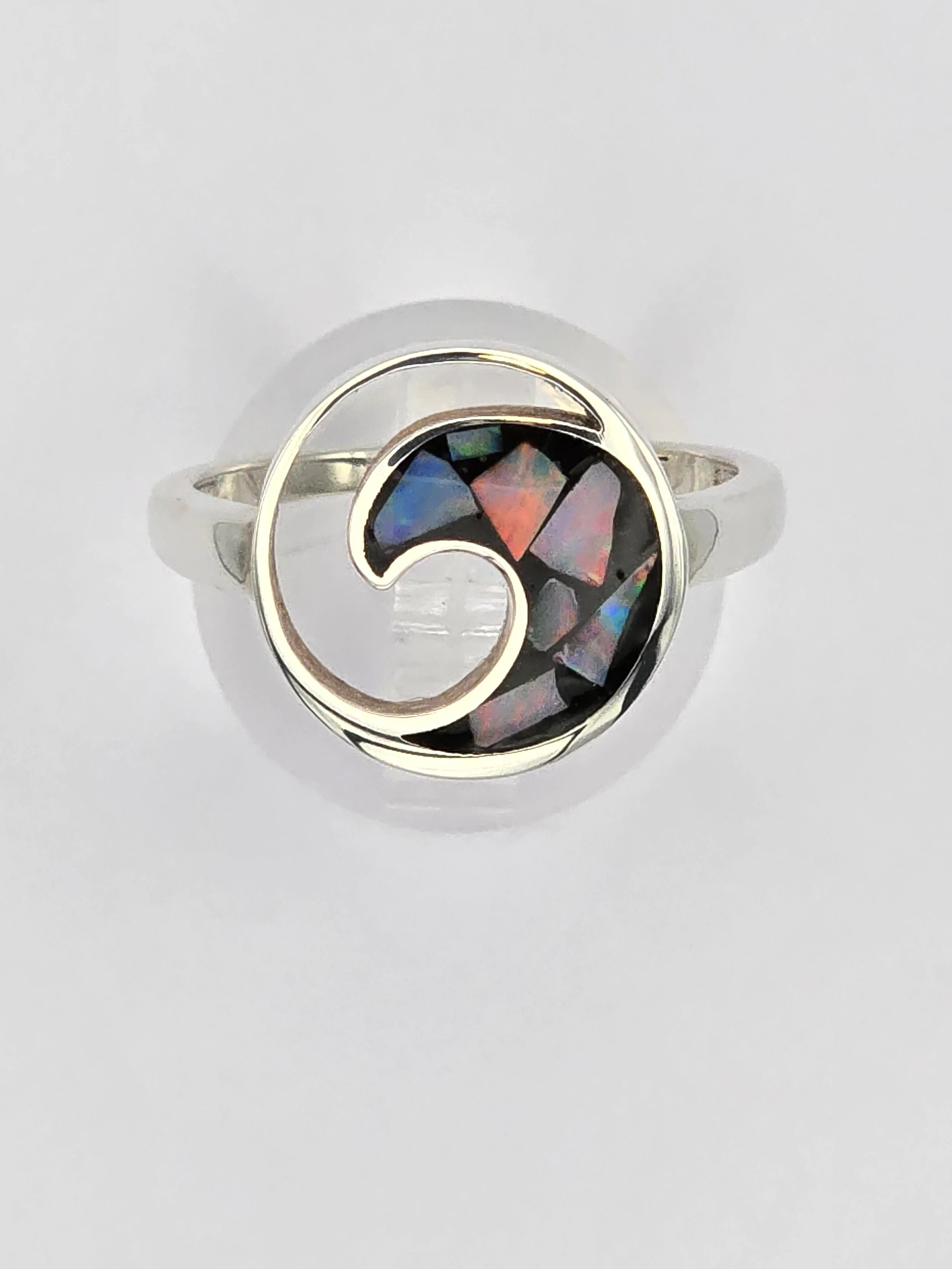 Beautiful Lil inlay wave ring. Australian Opal has been inlayed into this sterling silver wave ring. These are so bright in the sun. Enjoy 😉